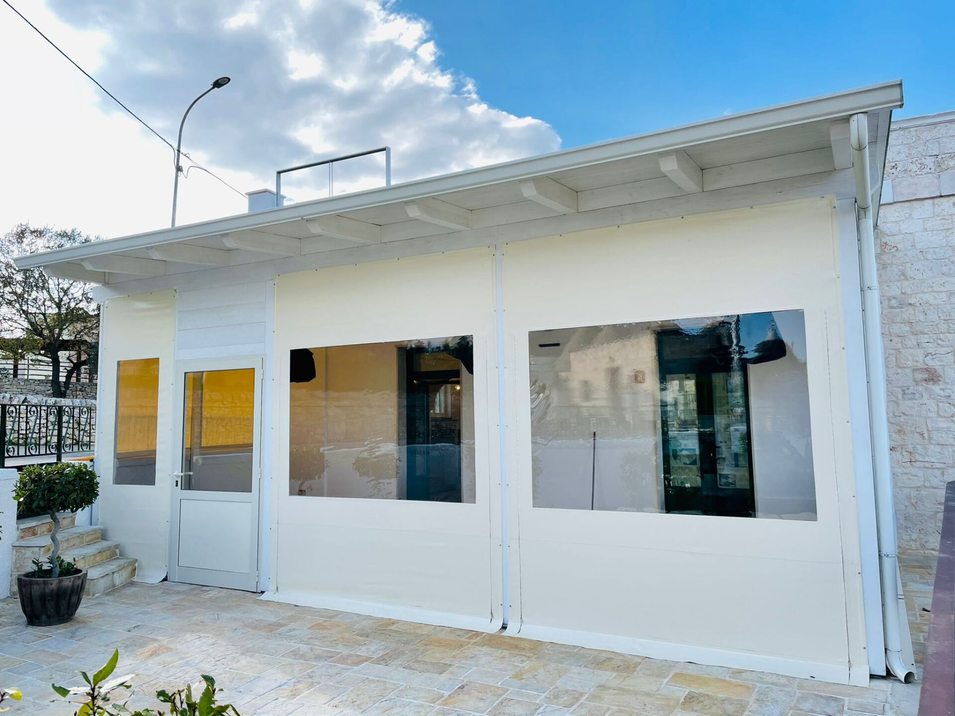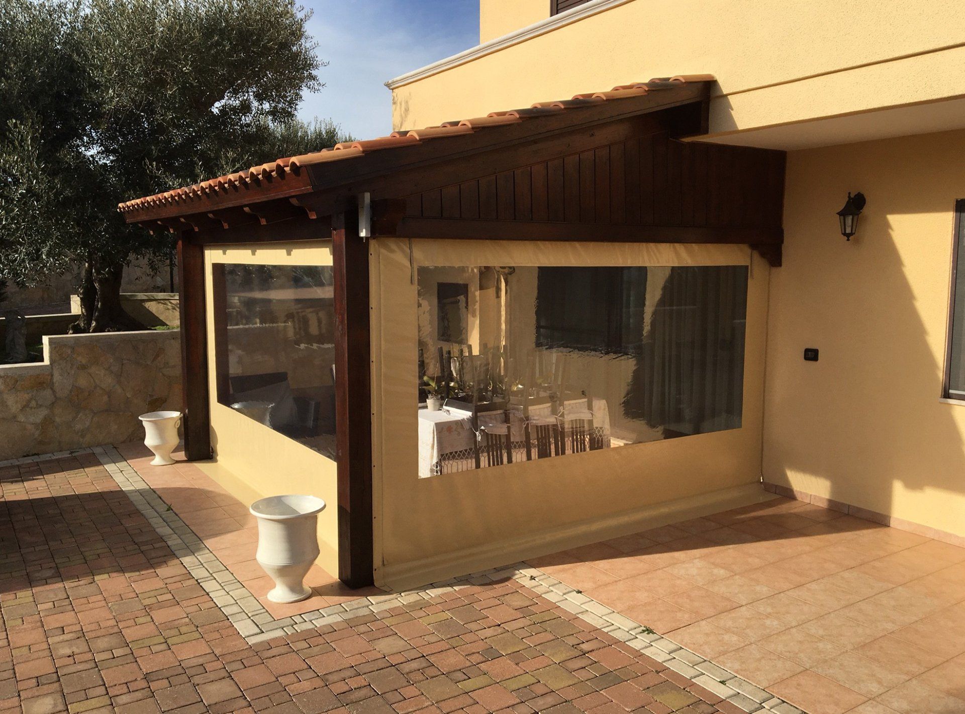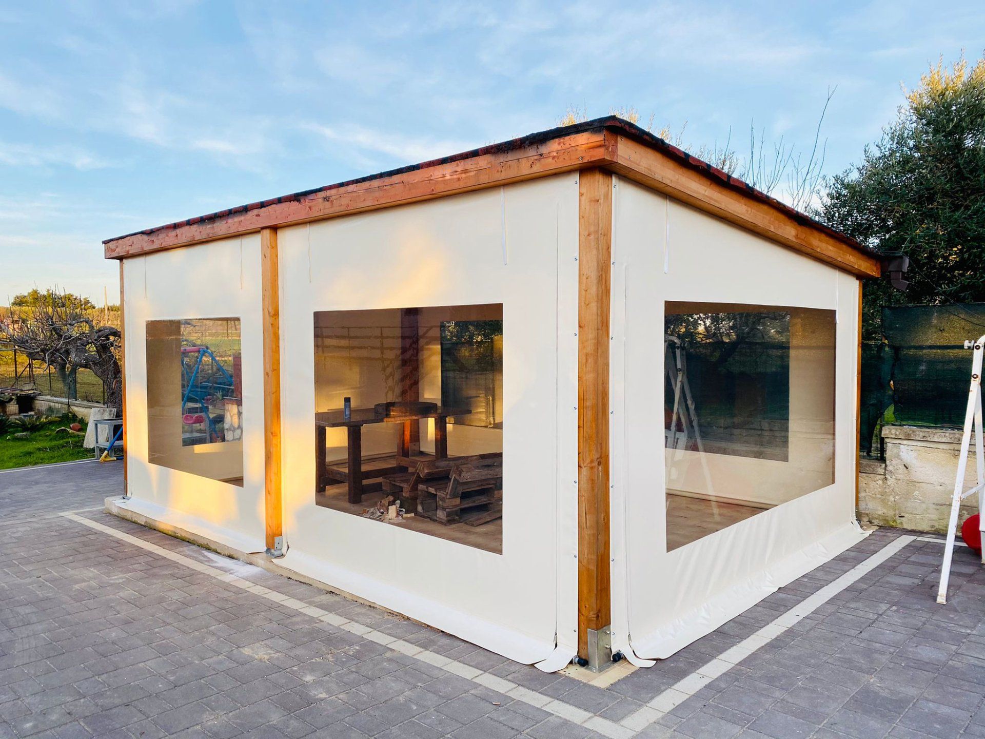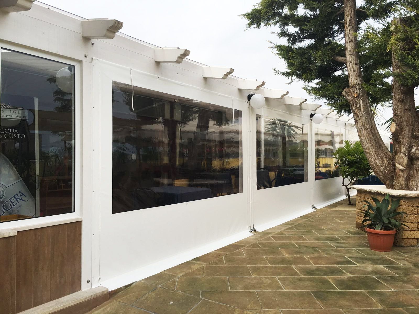 La copertura e le chiusure laterali di qualsiasi tipo di gazebo, pergole e dehors sono realizzate prevalentemente con teli in PVC di tipo ignifugo o non ignifugo.